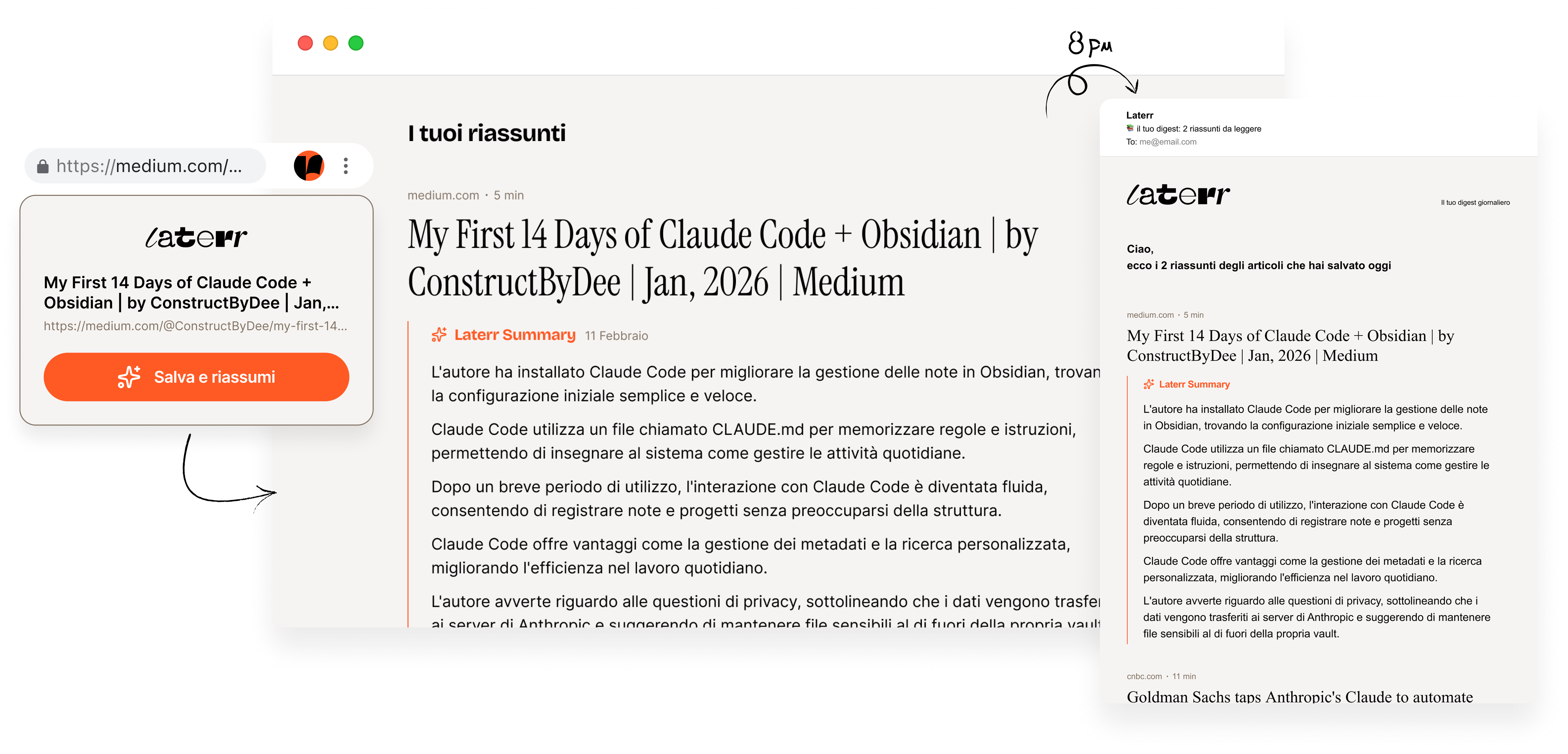 Ogni sera, una email con i riassunti di tutto ciò che hai salvato oggi.